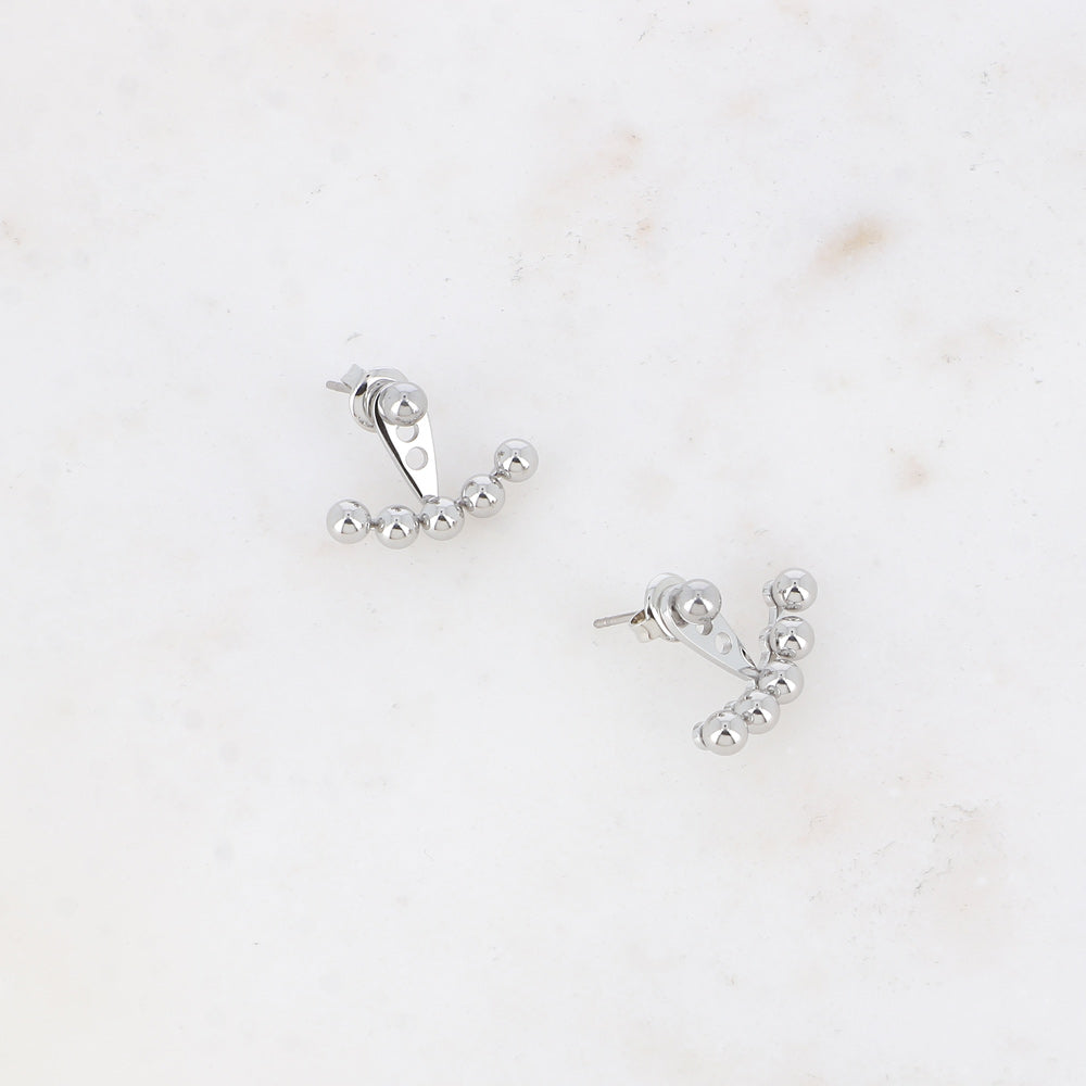 Stainless steel stud earrings consisting of a stud with a ball and an interchangeable piece with five balls.